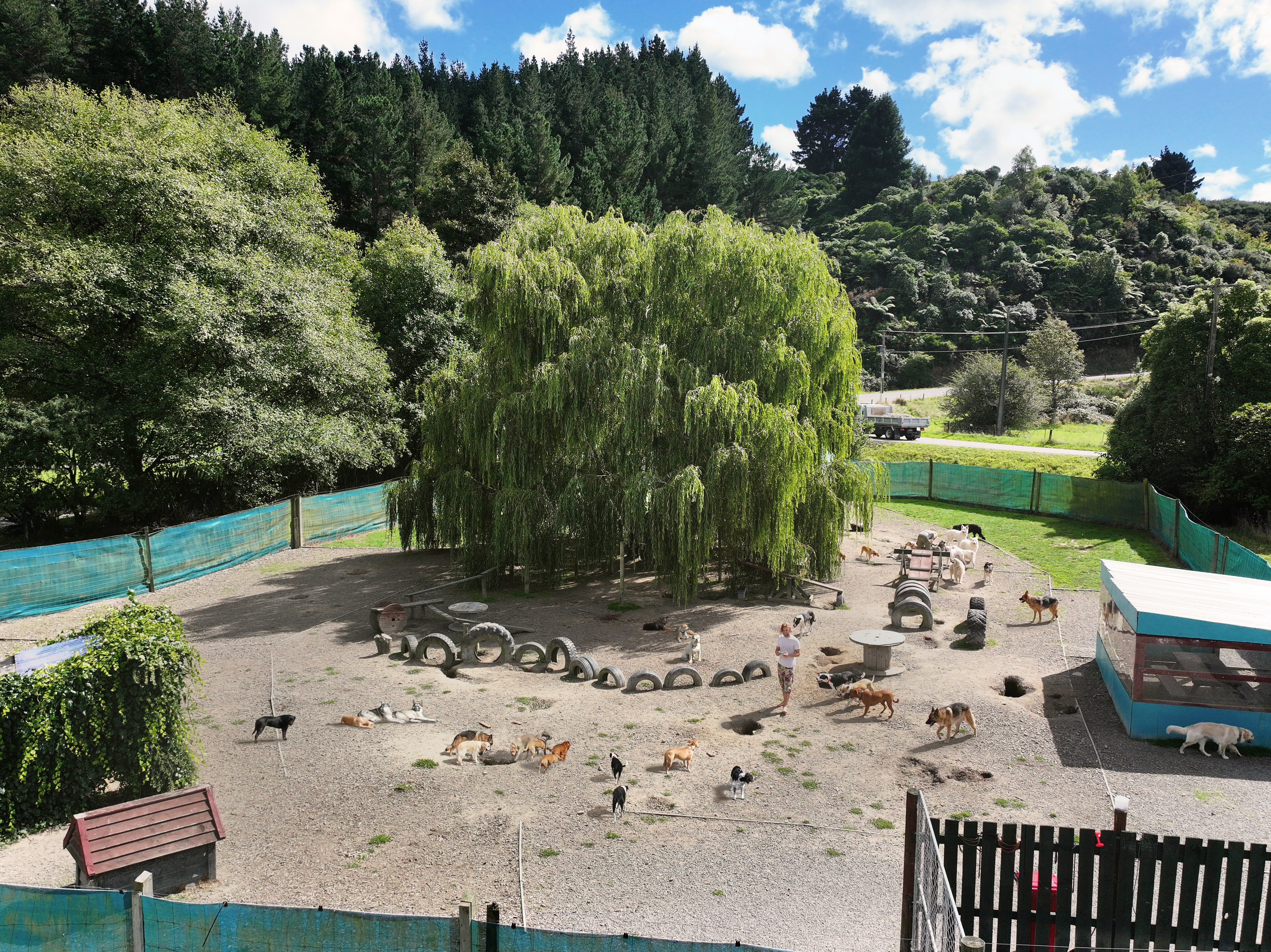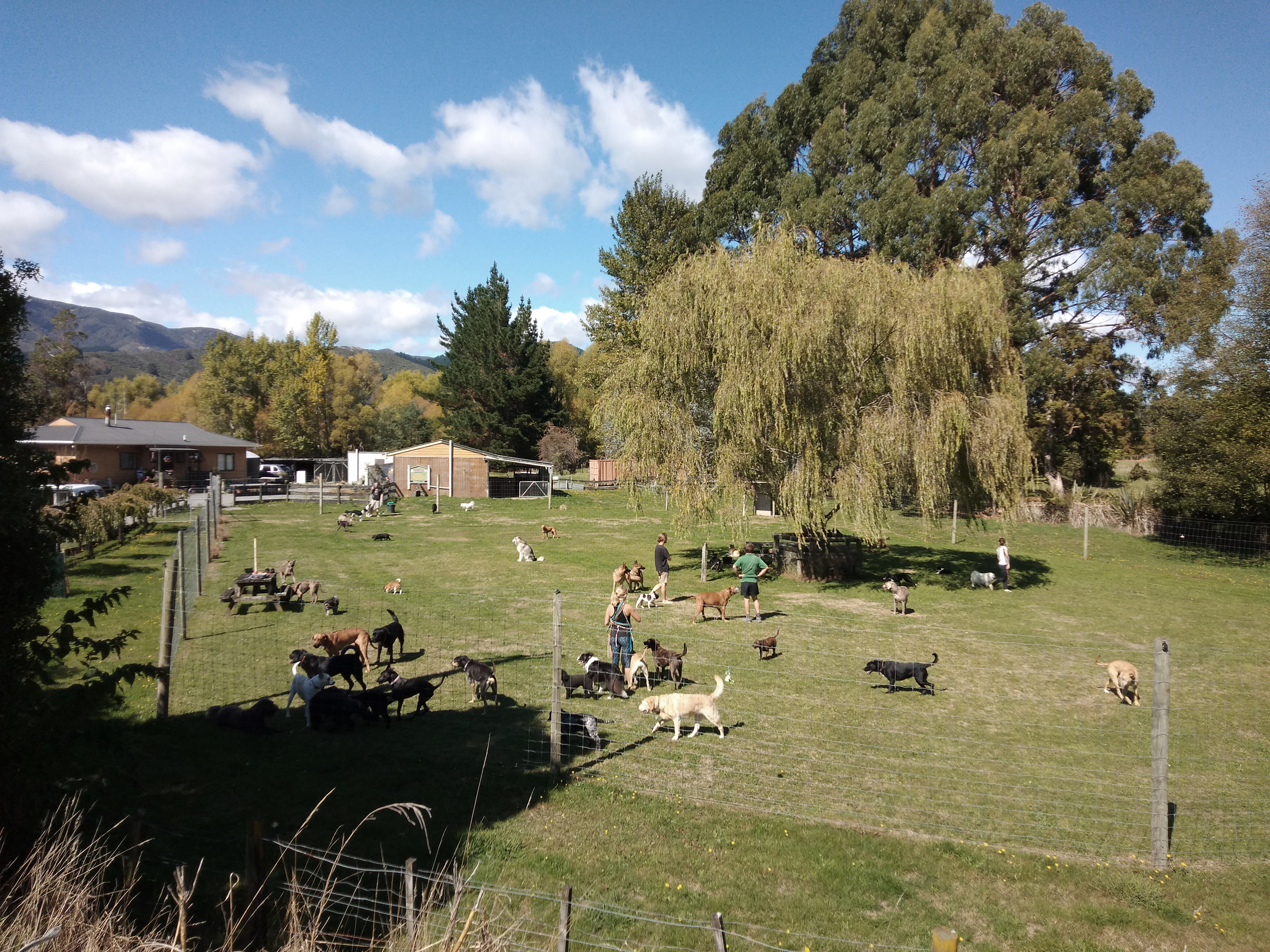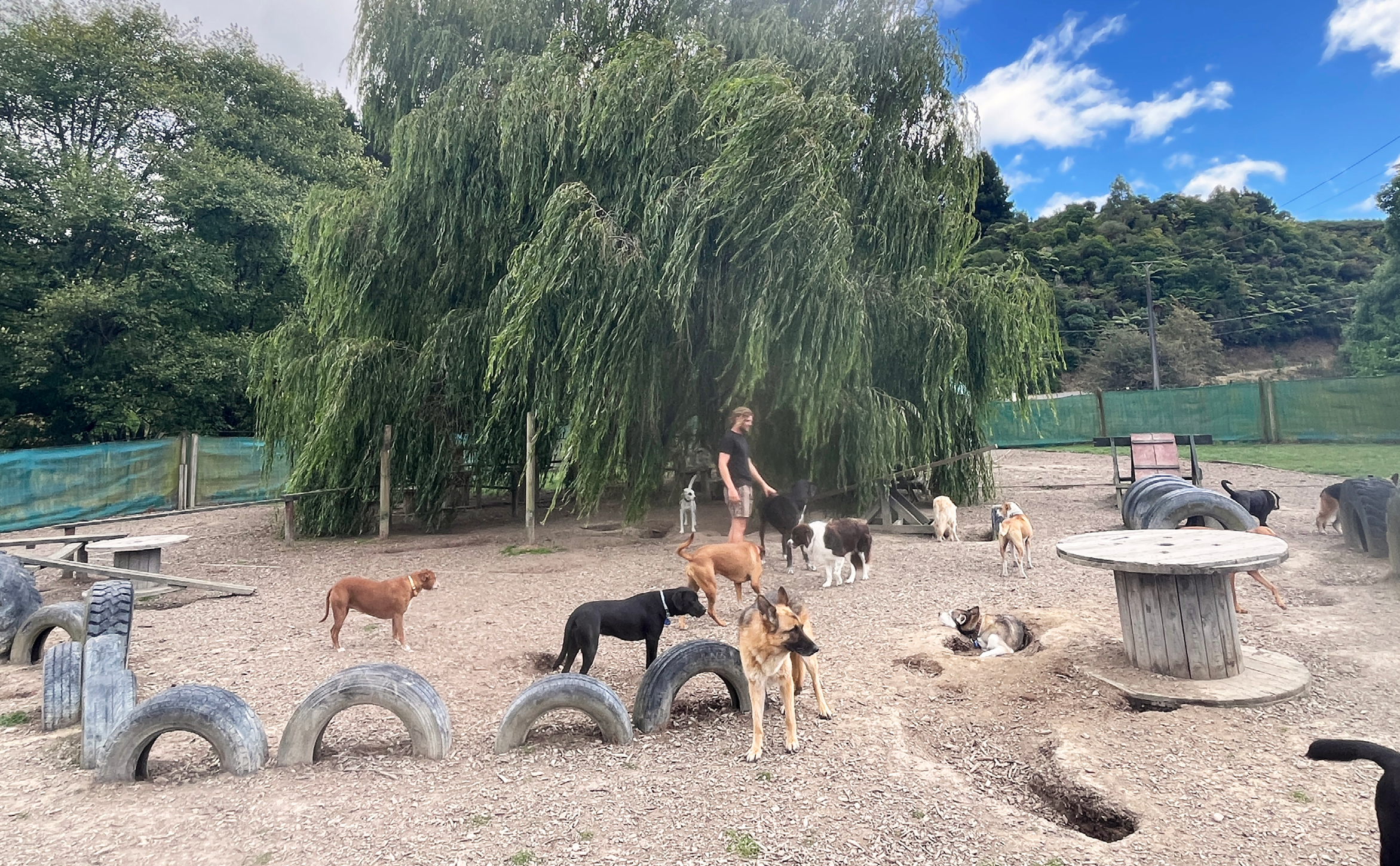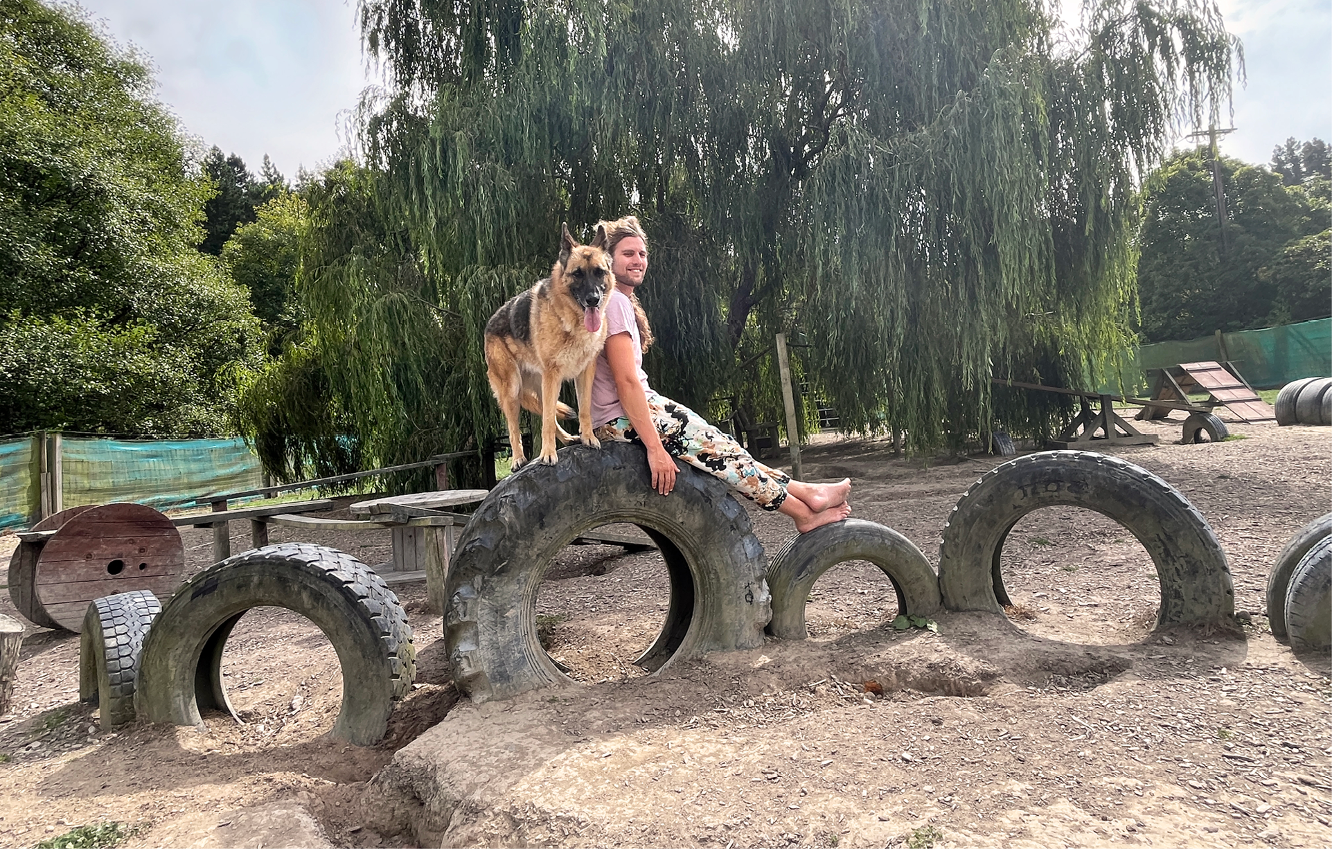 Under the watchful eye of our magnificent willow tree, we gradually transformed our spacious third of an Upper Hutt acre field. We added tyre trails, beam paths, ramps, tunnels and more for our dogs to wander, climb and explore around in fun and games. We also built up plenty of shelter and a big comfy hay bed for rest, adding to our sanctuary. We created our ultimate dog play haven, where they can come to connect, play and relax amongst nature and as a part of a pack.
