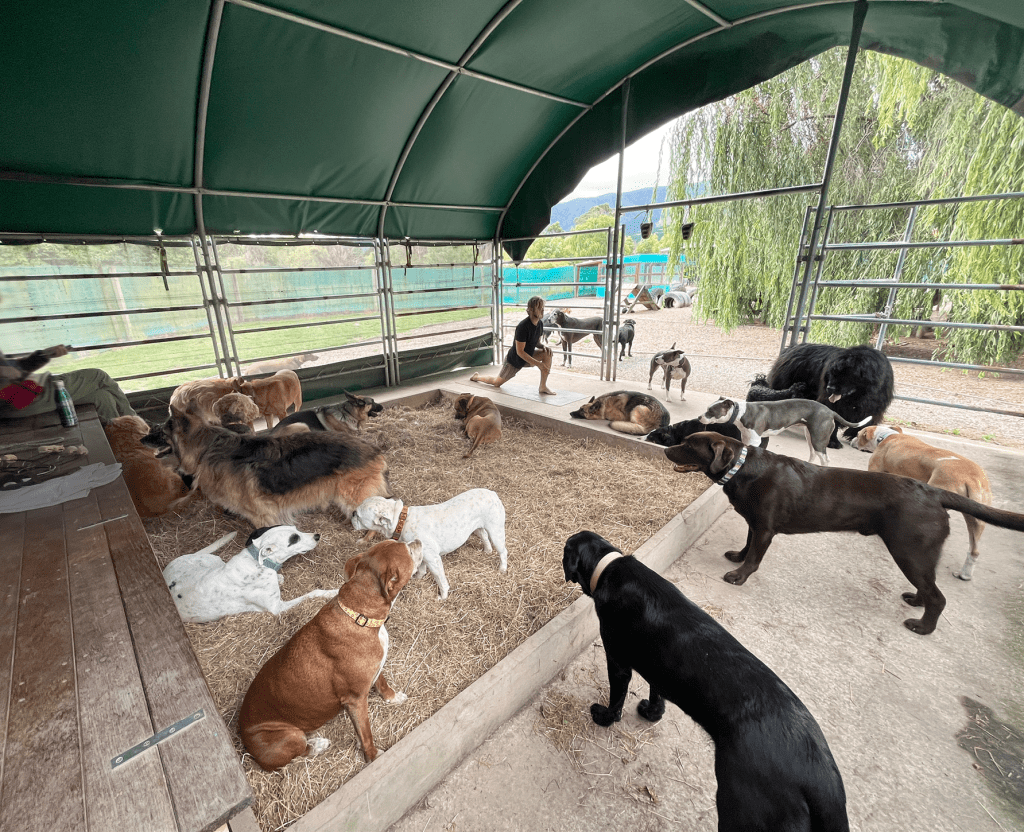 We believe dogs deserve a joyful and restful place of their own. So many dogs get cooped up inside at home or restricted on leashes when out and about. In our space they get to relax and vibe amongst their own as well as be wild and free, in fresh air and lush scenery. Our daycare combines friendly community, social development and play land adventure in a lush natural environment along with our own activity of wandering, dance, yoga and more to make up an ultimate play haven experience for your dogs to live their best lives.
